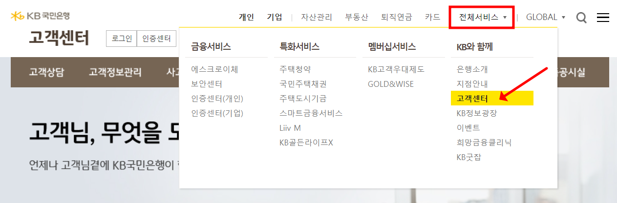 국민은행 고객센터는 국민은행 홈페이지 접속 후 [전체서비스] -> [고객센터]로 들어가시면 됩니다.