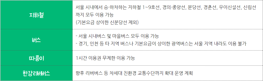 - 요금 : 매 월 6만 5천 원 충전 후 서울 내 지하철, 시내버스(마을버스), 따릉이 무제한 이용가능