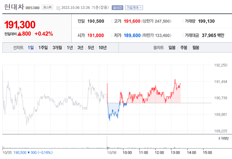 현대차는 1967년 12월에 설립되어 1974년 6월 28일에 유가증권시장에 상장됨. 현대차는 자동차 및 자동차부품을 제조 및 판매하는 완성차 제조업체로, 현대자동차그룹에 속하였으며, 현대자동차그룹에는 현대차를 포함한 국내 53개 계열회사가 있음. 소형 SUV인 코나, 대형 SUV인 팰리세이드, 제네시스 G80 및 GV80 등을 출시하여 SUV 및 고급차 라인업을 강화하였으며, 수소전기차 넥소를 출시함.