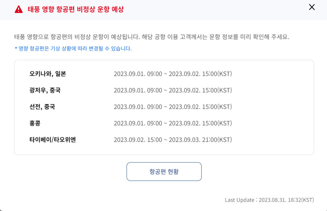 비행기 결항 여부를 확인하셔야 상황에 맞는 대처를 할 수 있으며 현재 대한항공에선 태풍의 영향으로 몇몇 항공편 비정상 운항 예상 하고 있습니다.