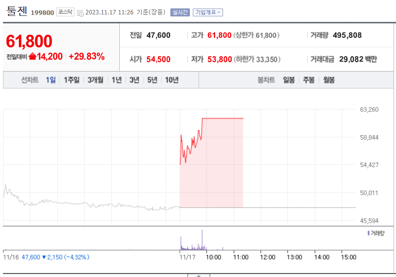 툴젠은 유전자교정 플랫폼 관련 사업을 영위하기 위해 1999년 10월 8일 설립되었고, 2021년 12월 10일 코넥스 시장에서 코스닥 시장으로 이전상장하였음. 유전자가위를 이용하여 세포 및 연구용 동물에서 유전체 교정을 대행하는 고부가가치 맞춤형 용역 서비스도 출시하여 상품/서비스 라인업을 다양화 함. 유전자가위 기술을 활용해 '병충해에 강한 사과/포도'를 개발하였고 세계에서 가장 작은 '개량형 유전자가위'를 개발함.