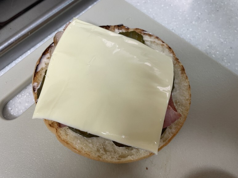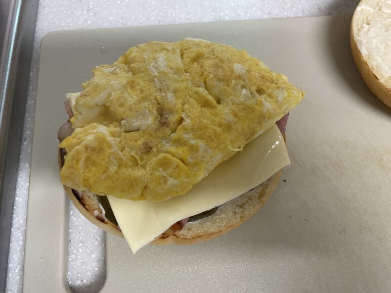 베이컨 위에 치즈, 위에 스크램블에그를 올려 치즈 양쪽에 뜨거운 재료가 가게 한다.