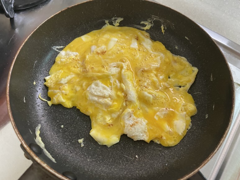 작은 팬에 계란을 올려 저어가며 스크램블에그를 만든다. 80%정도 익히는걸 추천