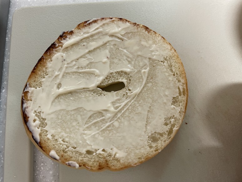 베이글은 반을 갈라서 양쪽 다 마요네즈를 발라준다.