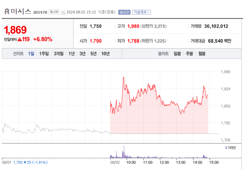 휴마시스는 2000년 6월 12일에 설립되었으며, 체외진단용의료기기(검사시약 및 면역정량분석장비)를 생산하고 있음. 체외 진단 분야 중에서 POCT 면역 분석시약 제품군, POCT 면역 정량분석기기 제품군, 신소재 및 신규마커 개발분야에 휴마시스의 특화된 연구 역량을 집중함. 2024년 3월 26일에 개최된 정기주주총회에서 신규 목적사업의 승인을 득하여 광물생산과 관련한 제조 및 판매 등을 진행할 예정임.