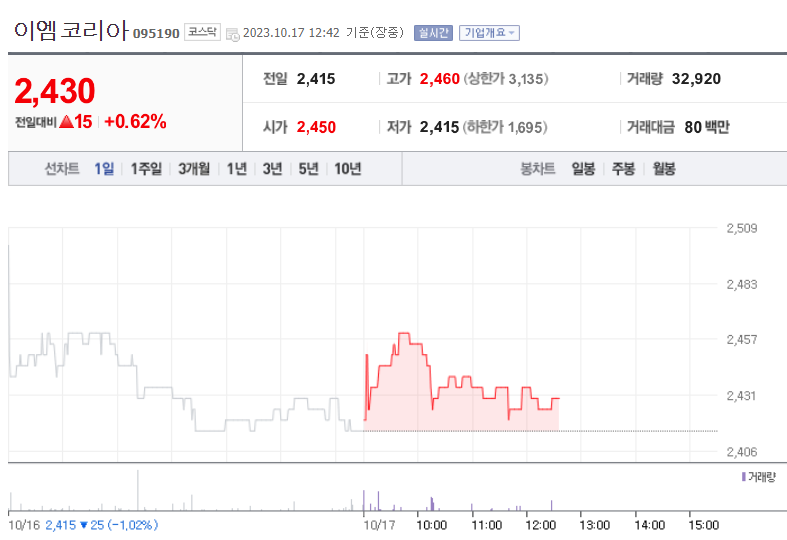 이엠코리아는 2003년 공작기계제조업을 영위할 목적으로 설립되었으며, 2005년 공작기계핵심부품 및 방산제품, 발전설비제품을 생산하는 동우정밀을 자산양수도 방식으로 인수하였음. 이엠코리아는 공작기계 완성품 및 부품을 제작하여 국내 주요 공작기계 업체에 OEM 형식으로 납품하고 있음. 그 외에도 방산항공부품, 발전부품, 터널굴착기(TBM), 에너지및 환경설비 등 다양한 분야의 부품 및 설비를 국내 주요 업체 중심으로 납품하고 있음.