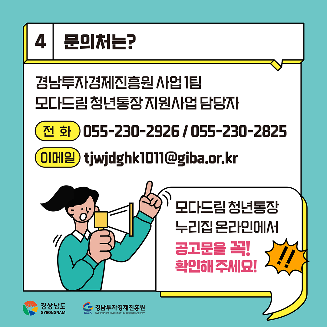 신청 후 선발 결과는 2023년 10월 중 발표되며 기타 문의사항의 경우 경남투자경제진흥원 사업 1팀 모다드림 청년통장 지원사업 담당자에게 문의하시면 됩니다.